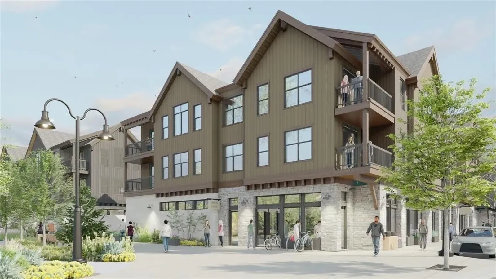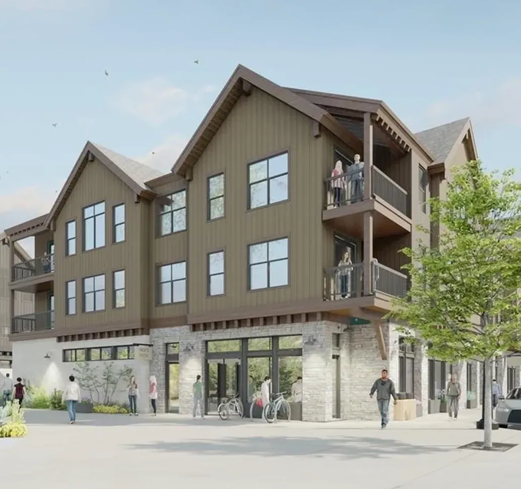The property includes 72 apartments across four three-story buildings surrounding a public plaza with 10,757 RSF of ground-floor and standalone retail. The exterior will feature contemporary mountain-style finishes, blending stone and woodgrain siding, and will complement nearby developments like the Silverthorne Performing Arts Center and Fourth Street Crossing condominiums.